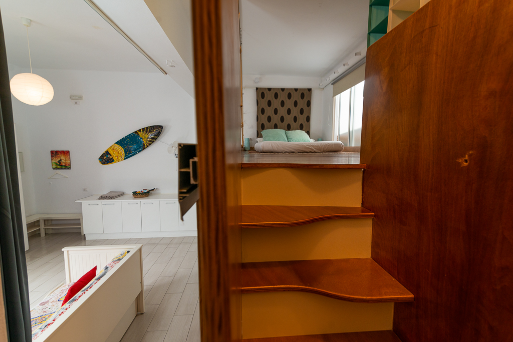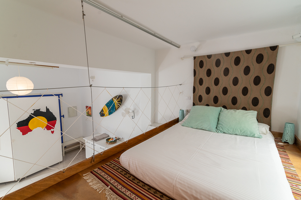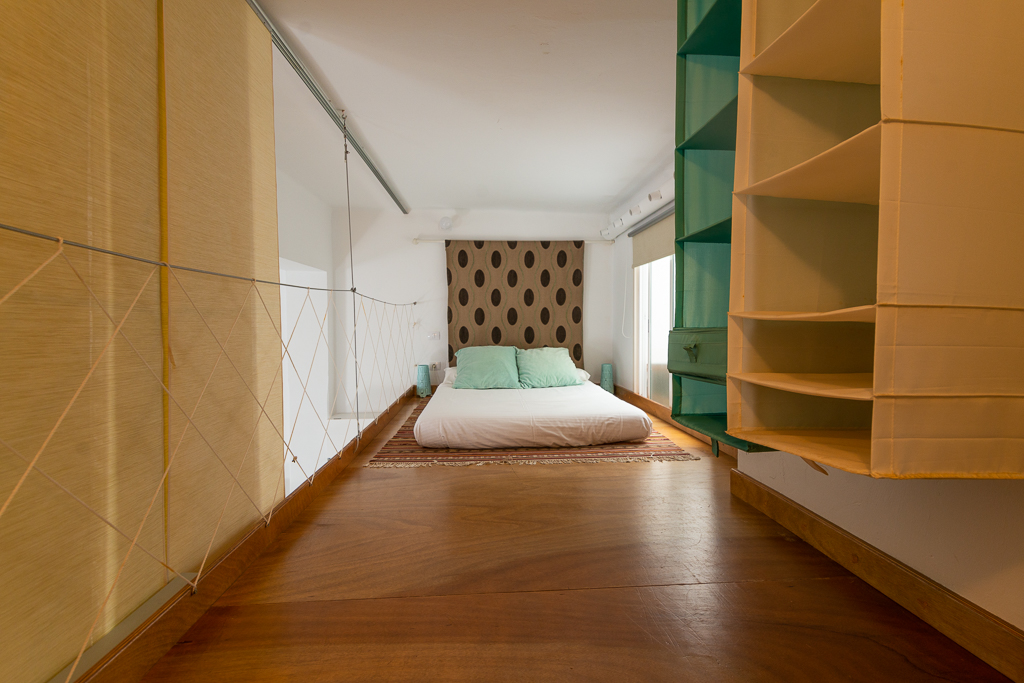 Una escalera que sube al dormitorio doble en la entreplanta de madera, con un colchón de látex natural (140×190 cm) sobre una alfombra de lana, y un gran perchero con estantes de almacenamiento. Toda la ropa de cama es de algodón 100%.
