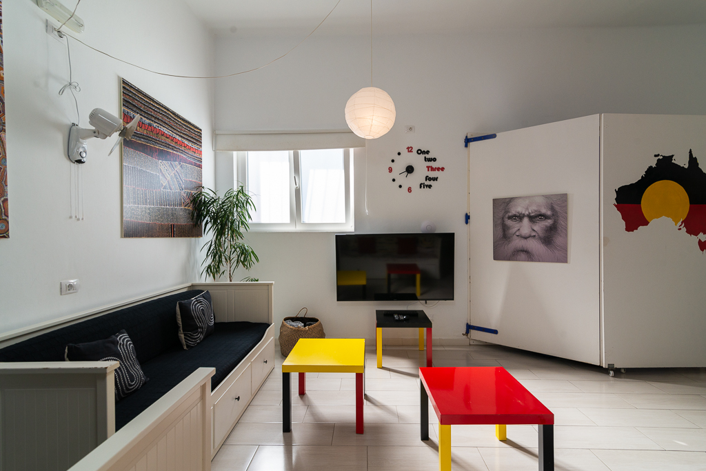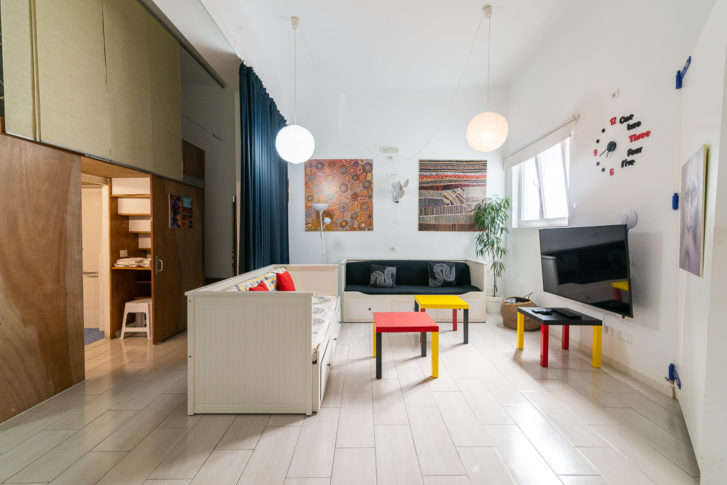 La zona de estar dispone de dos sofás simples (80×200 cm) convertibles en dos camas dobles (160×200 cm), SmartTV de 60” (152 cm) con conexión satelital e internet, navegador web con teclado y ratón inalámbricos. WiFi por fibra óptica.