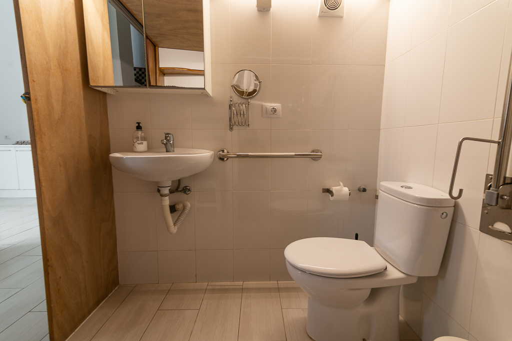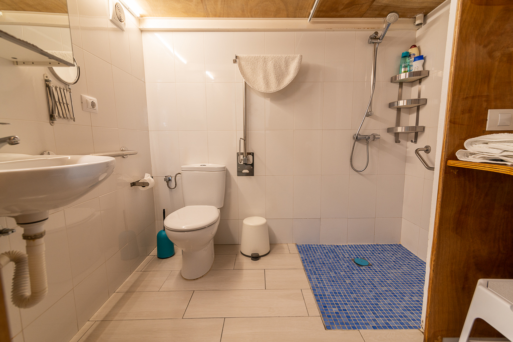 Hay un baño con ducha adaptado para sillas de ruedas y con ayudas para discapacitados.