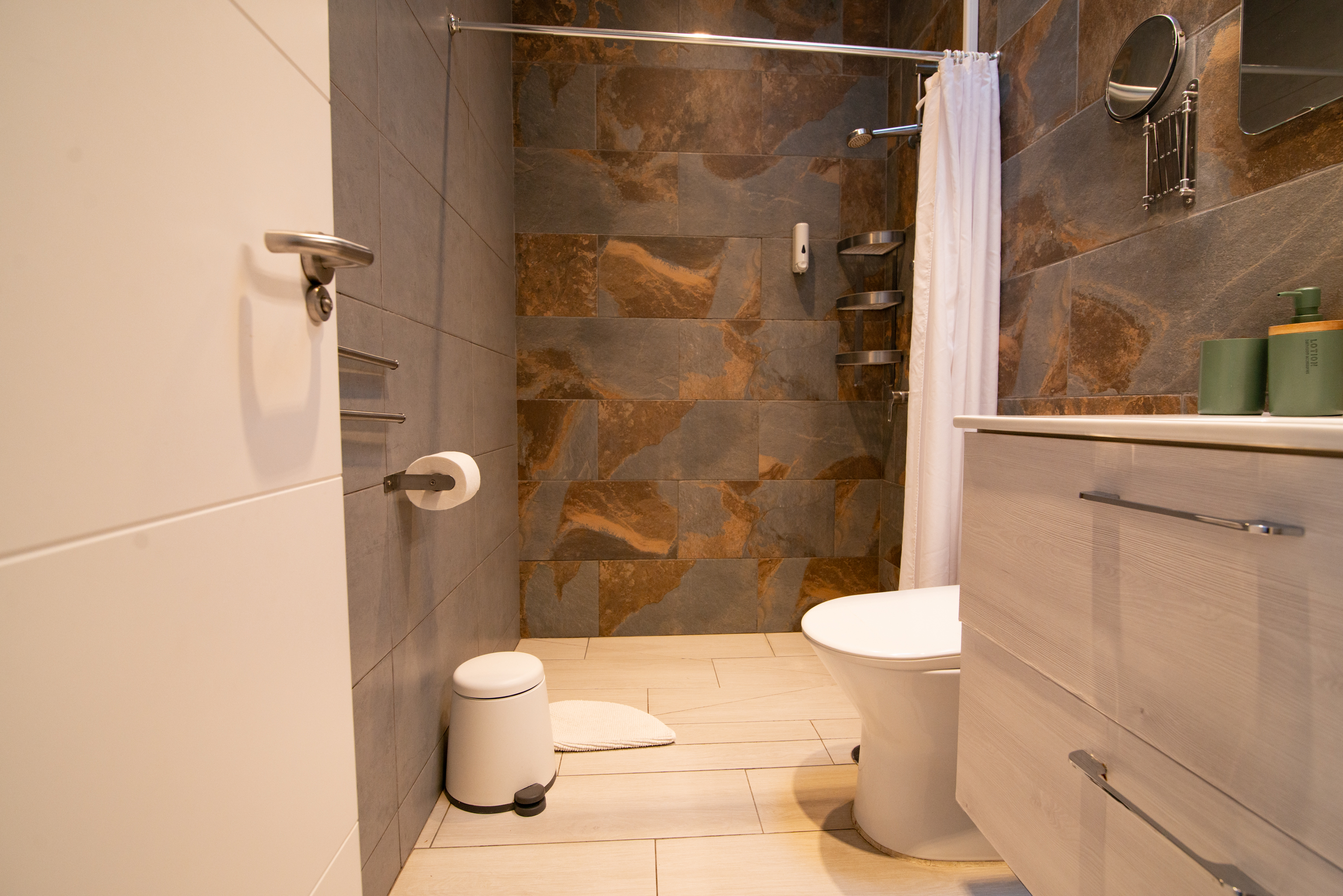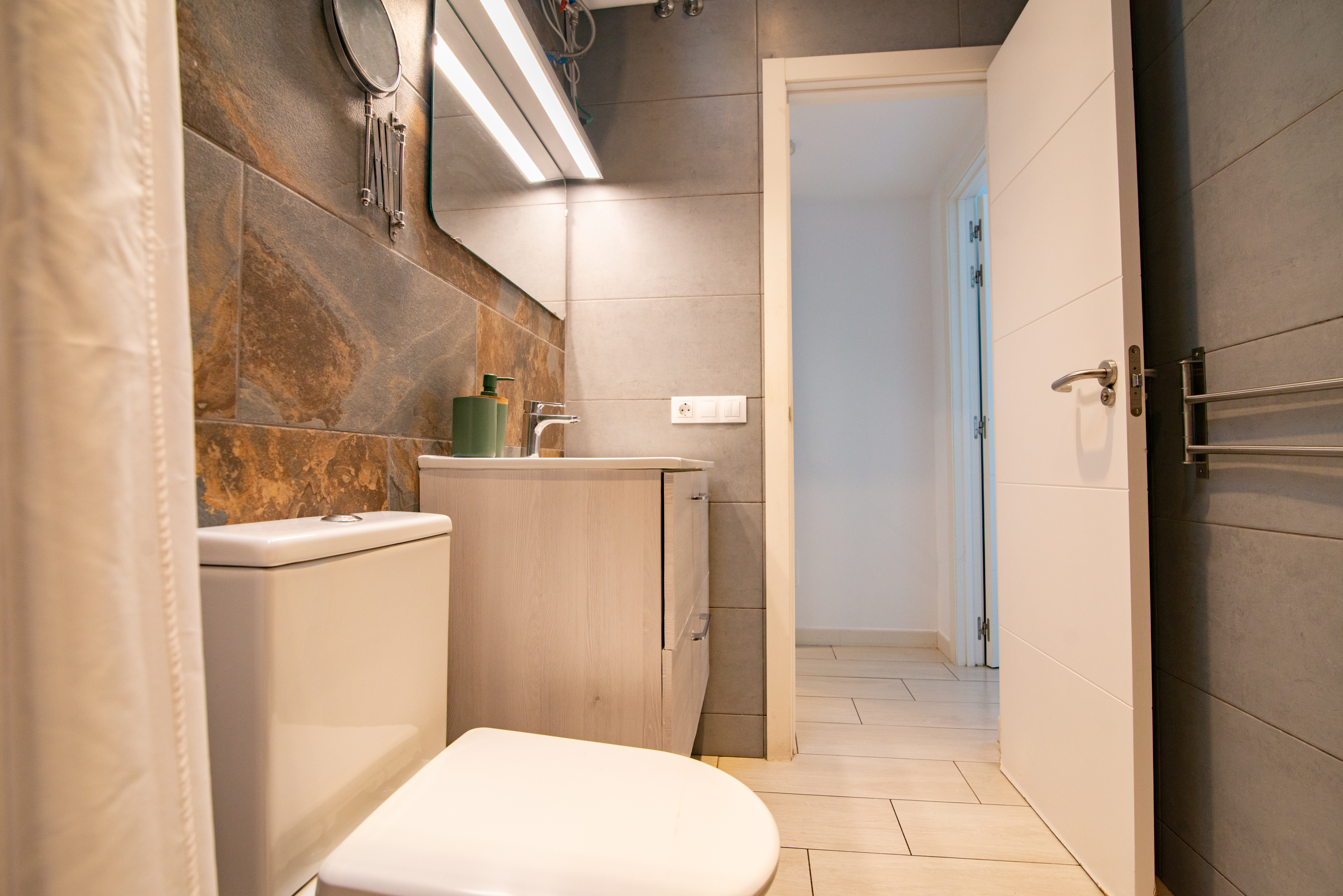 El baño tiene acceso independiente desde el salón o el dormitorio por un distribuidor, y tiene iluminación cenital. La ducha es de 1,35×1,0 m. y dispone de agua caliente solar.