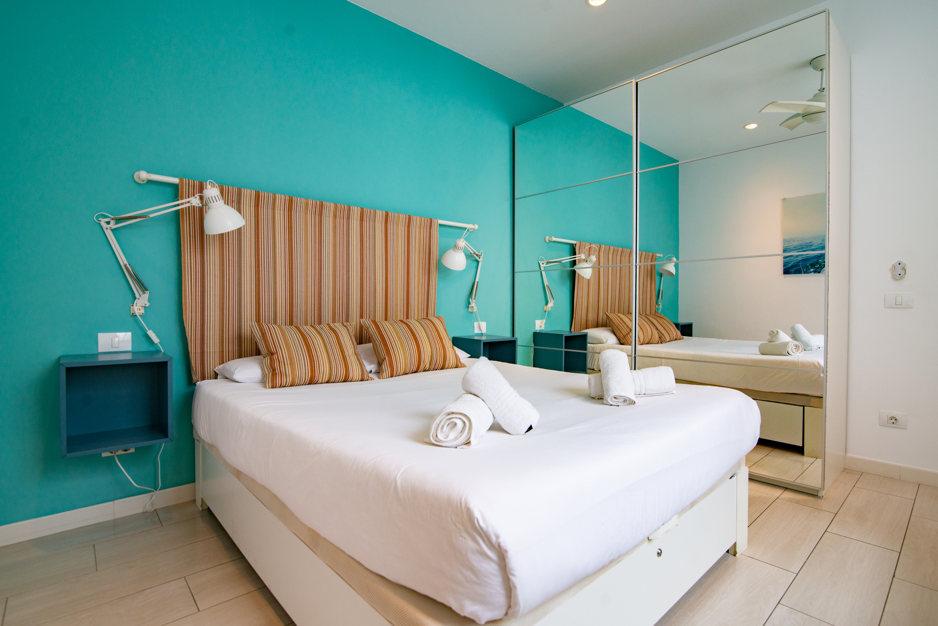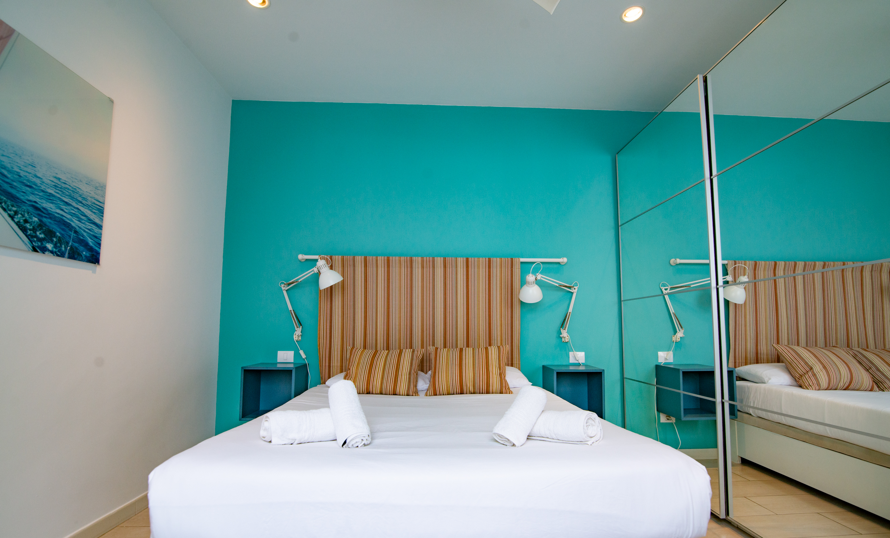 El amplio dormitorio tiene una cama doble (150×190 cm), un diván-cama individual (80×200 cm), y un armario-espejo de 2 m con caja de seguridad. Toda la ropa de cama es de algodón 100%.