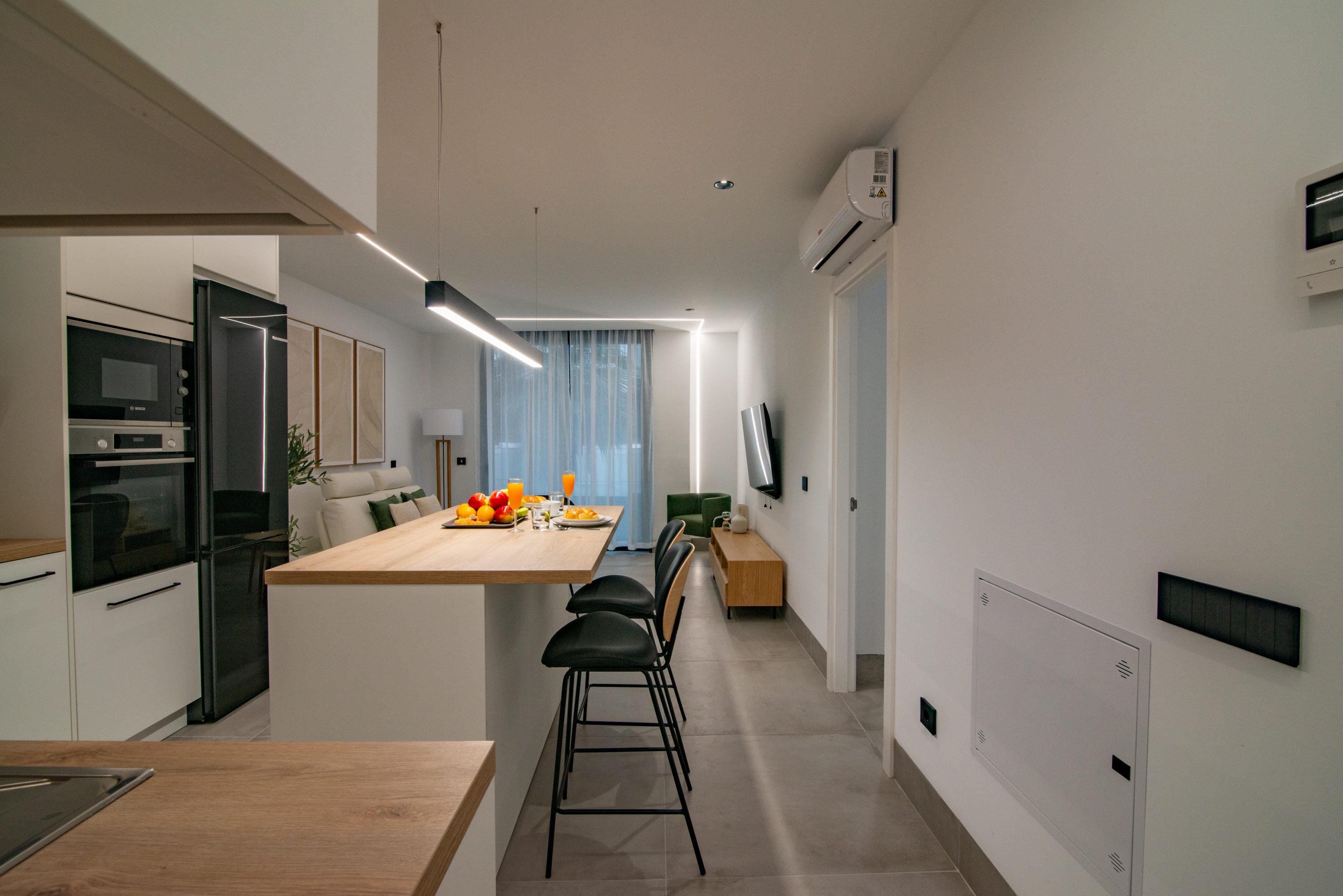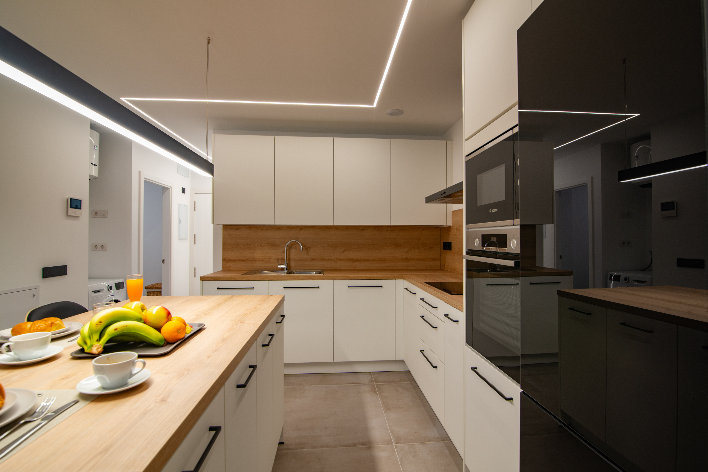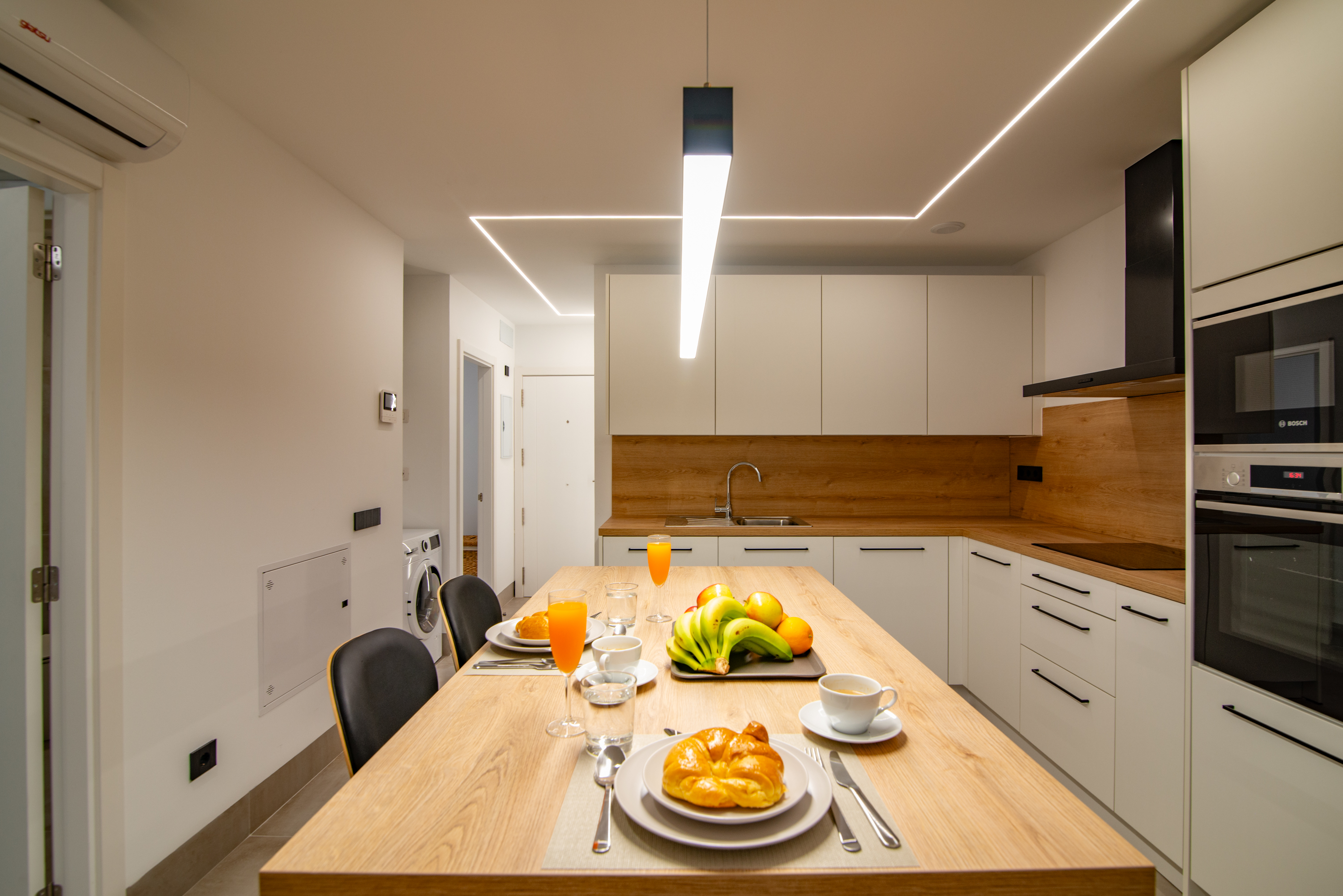 Cocina totalmente equipada con horno, microondas, lavavajillas, cafetera y más.