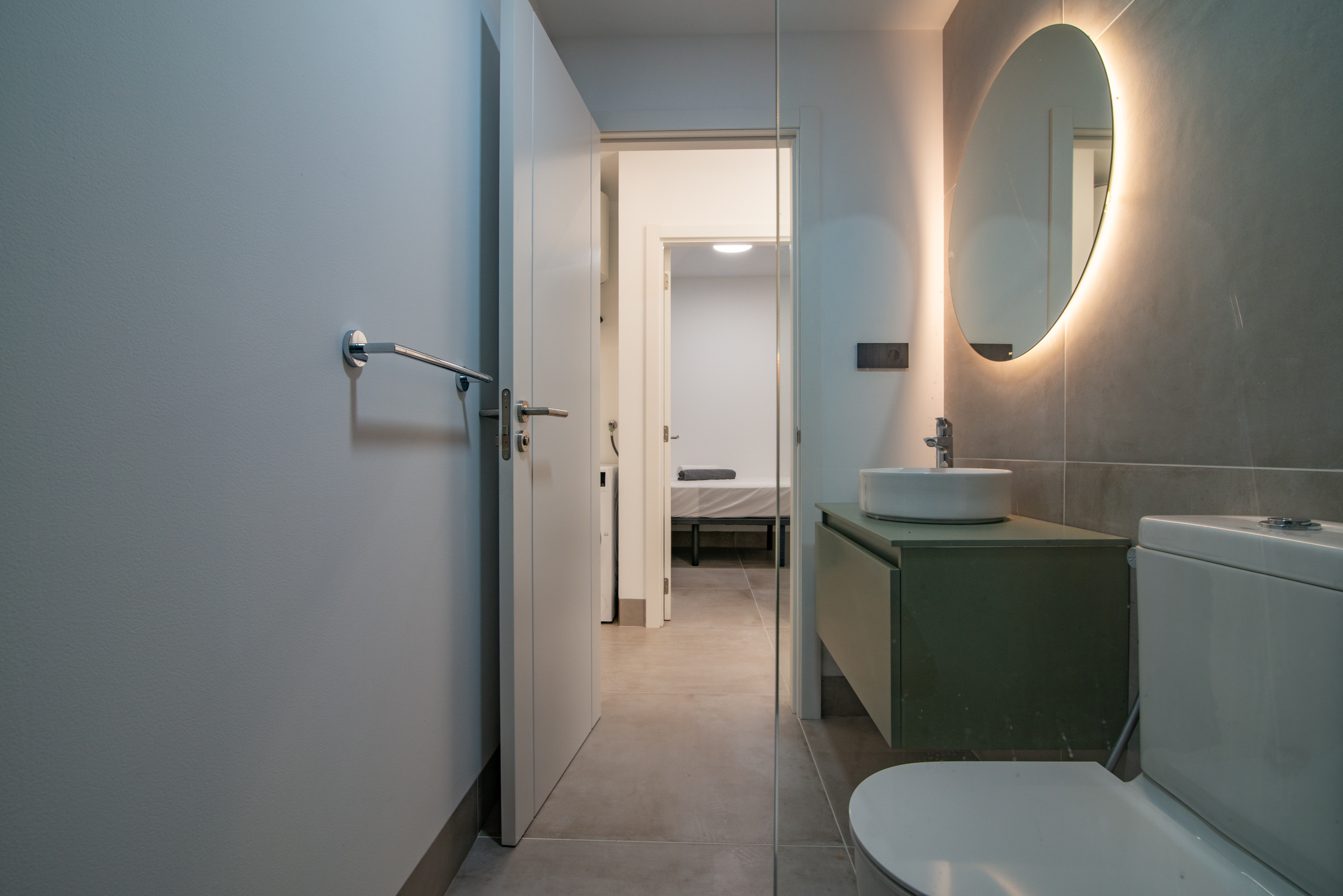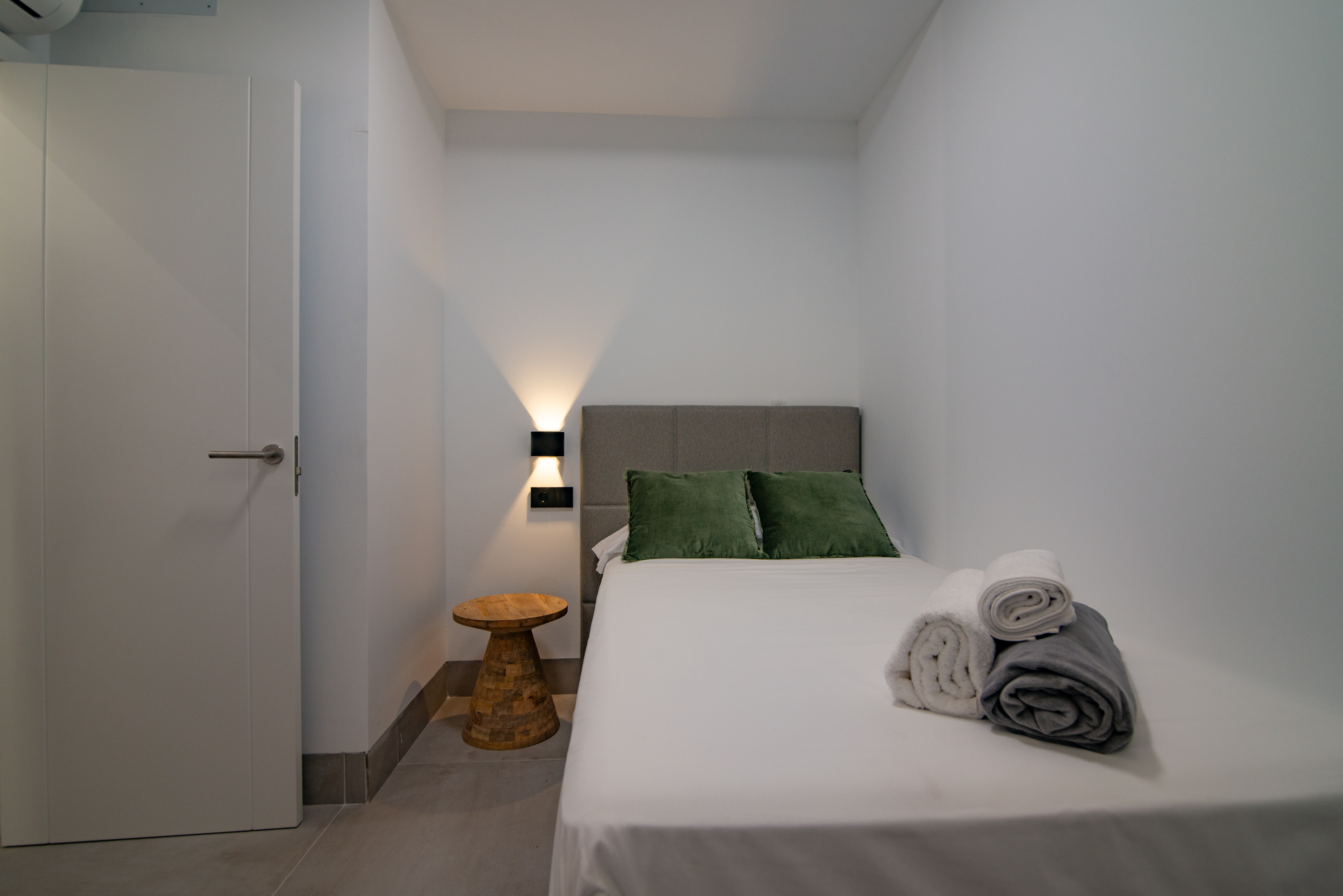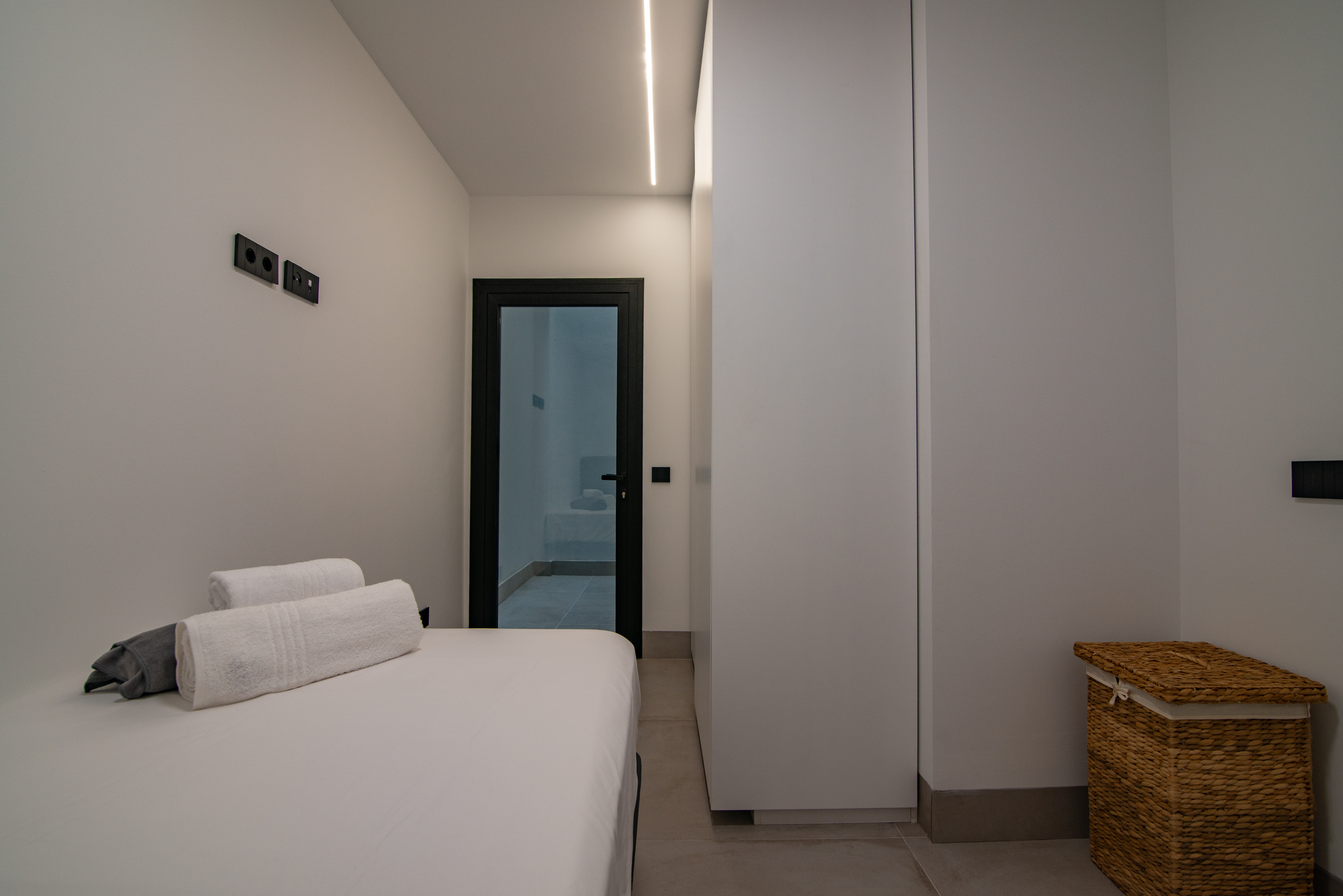 El dormitorio principal cuenta con cama king-size de 180 cm, amplio armario y baño en suite con ducha y mampara de cristal. El segundo dormitorio con cama individual de 105 cm y armario.
