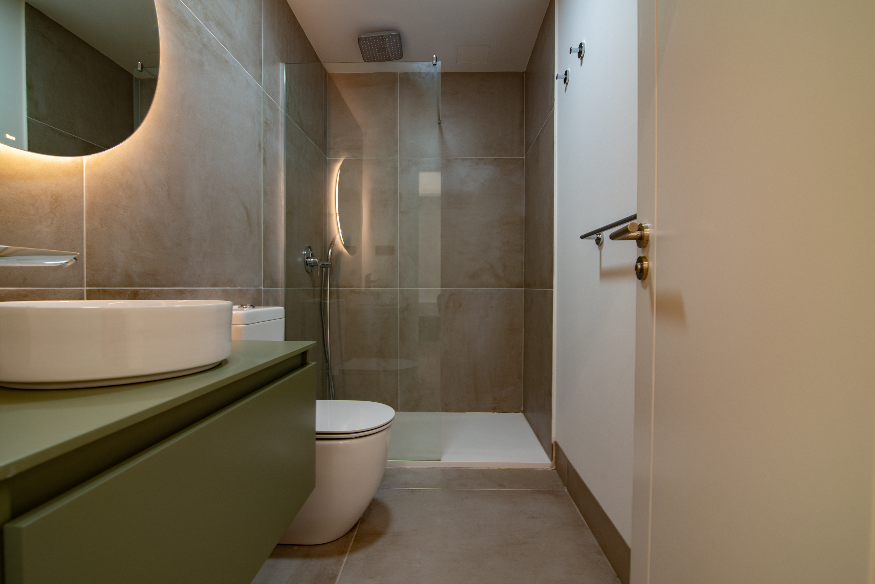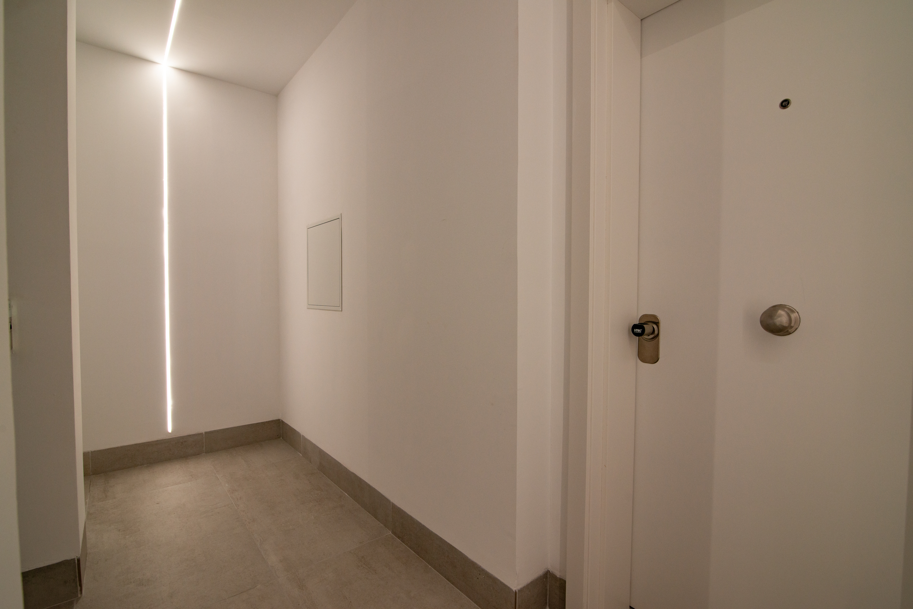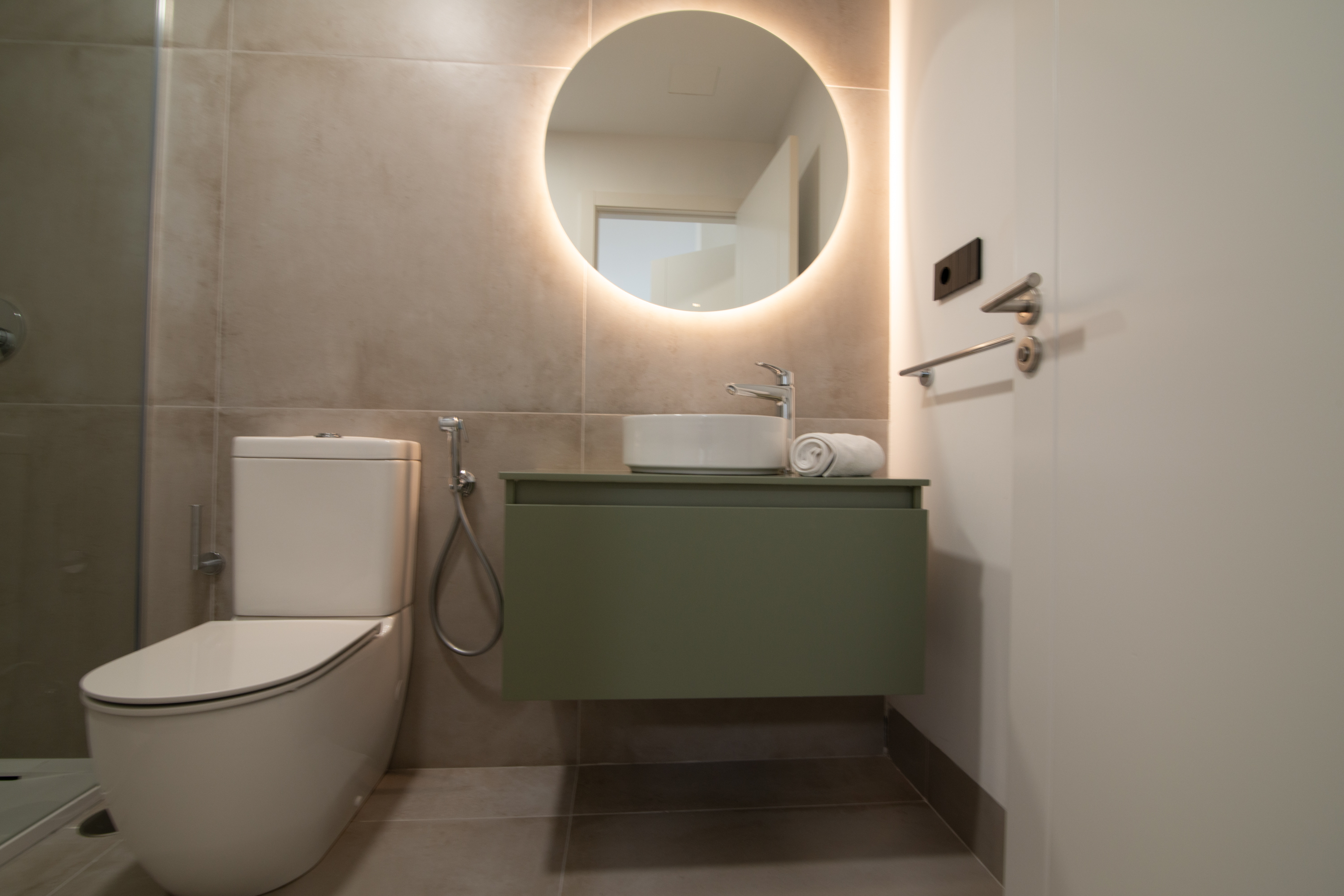 El dormitorio principal cuenta con cama king-size de 180 cm, amplio armario y baño en suite con ducha y mampara de cristal. El segundo dormitorio con cama individual de 105 cm y armario.