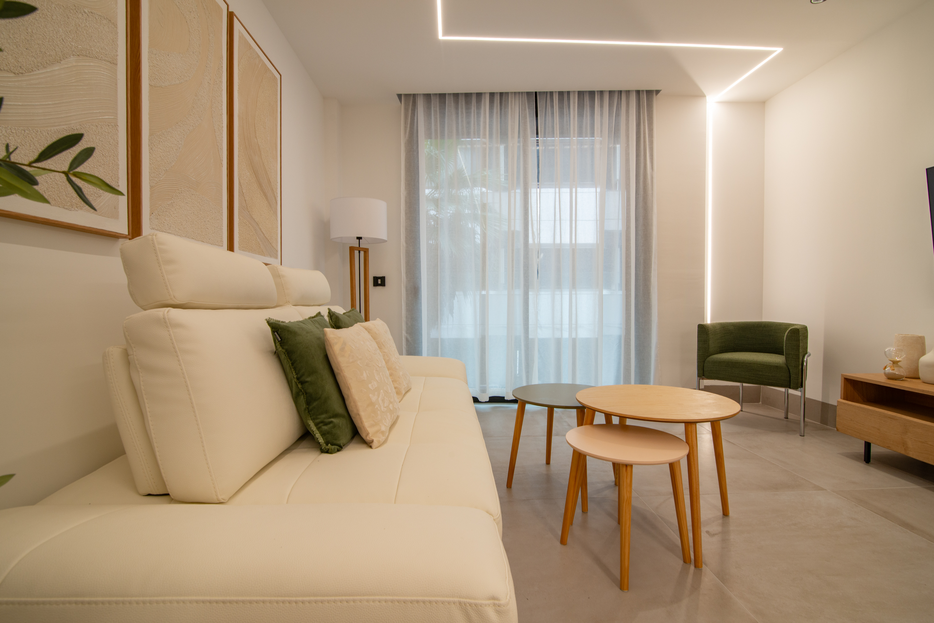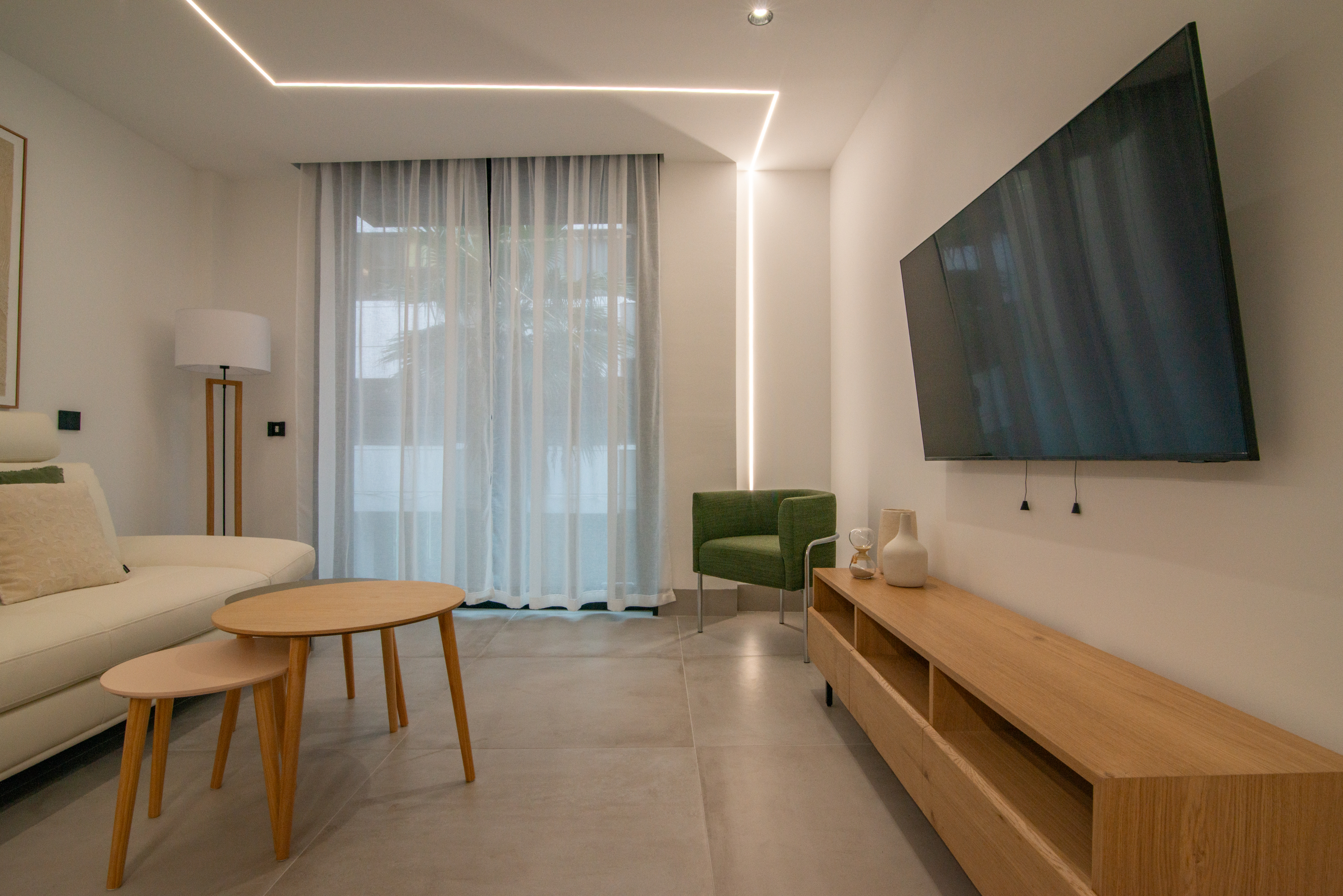 Salón con sofá de piel, Smart TV y aire acondicionado en todas las estancias.